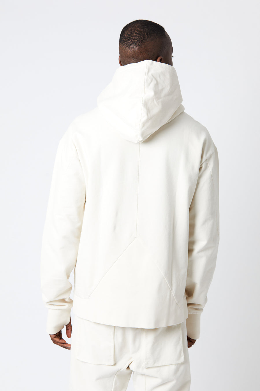 Thom Krom garments feature raw edges, asymmetric cuts, exposed seams, and distressed finishes for a deconstructed look. Key details also include garment-dyed fabrics, layered textures, concealed zippers, thumbhole cuffs, and mixed materials like cotton blends for flexibility.