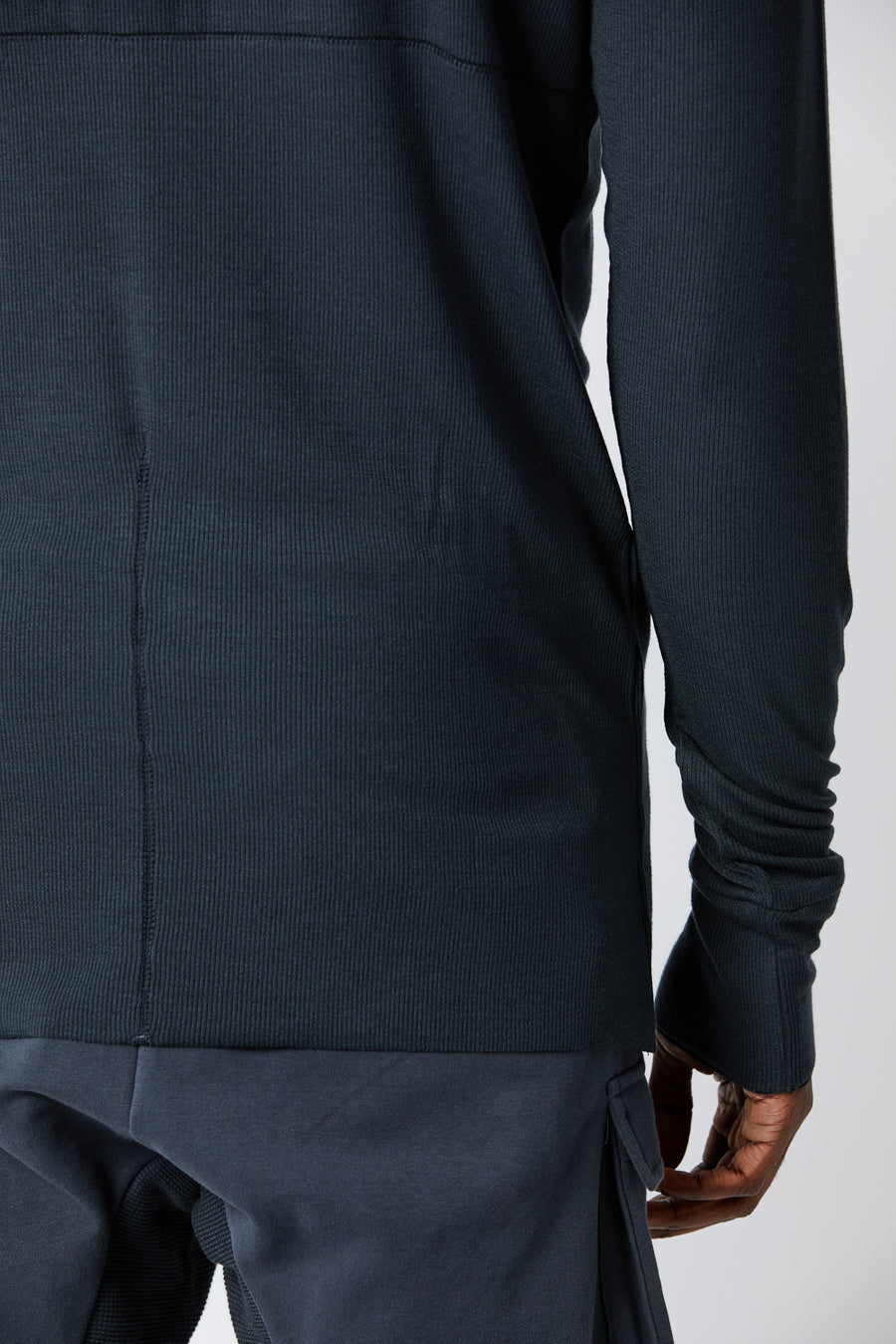 Thom Krom garments feature raw edges, asymmetric cuts, exposed seams, and distressed finishes for a deconstructed look. Key details also include garment-dyed fabrics, layered textures, concealed zippers, thumbhole cuffs, and mixed materials like cotton blends for flexibility.